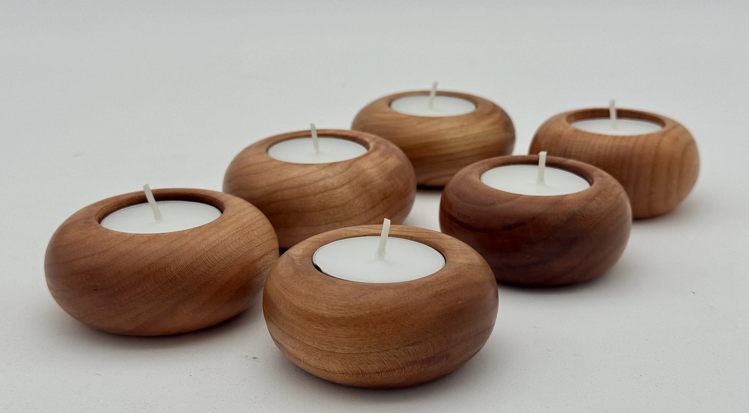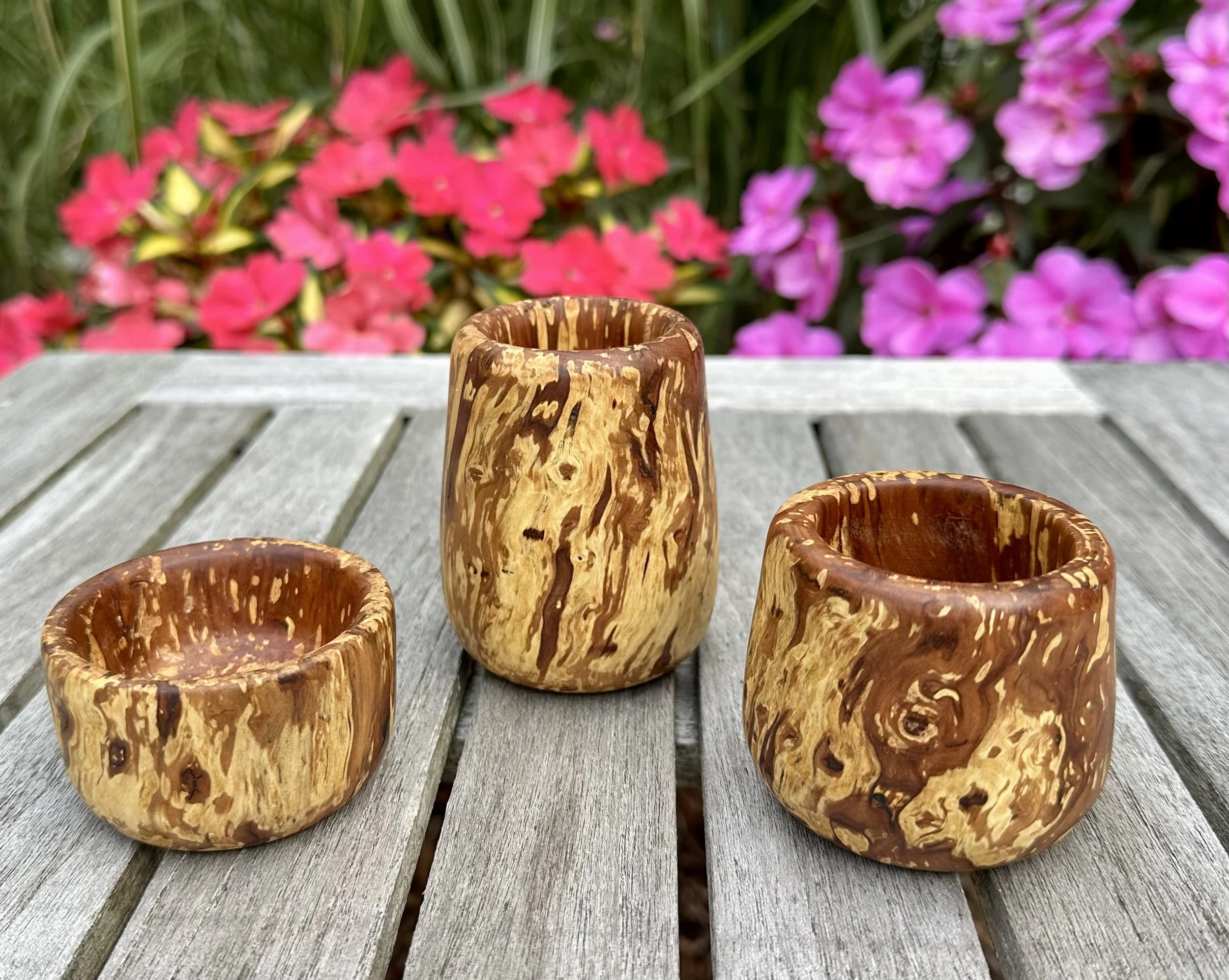 Two handcrafted wooden bowls with natural patterns on a white background.
